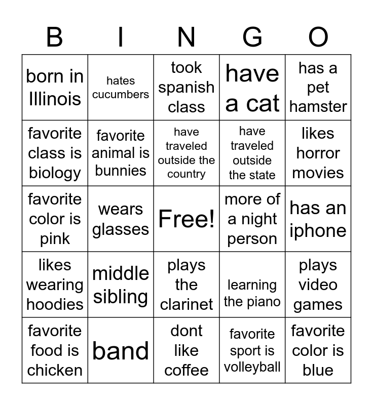 This bingo card has a free space and 24 words: middle sibling, band, have traveled outside the country, favorite food is chicken, has a pet hamster, born in Illinois, favorite class is biology, hates cucumbers, more of a night person, plays the clarinet, have traveled outside the state, favorite color is pink, learning the piano, plays video games, favorite animal is bunnies, favorite sport is volleyball, has an iphone, took spanish class, likes horror movies, wears glasses, favorite color is blue, likes wearing hoodies, have a cat and dont like coffee.