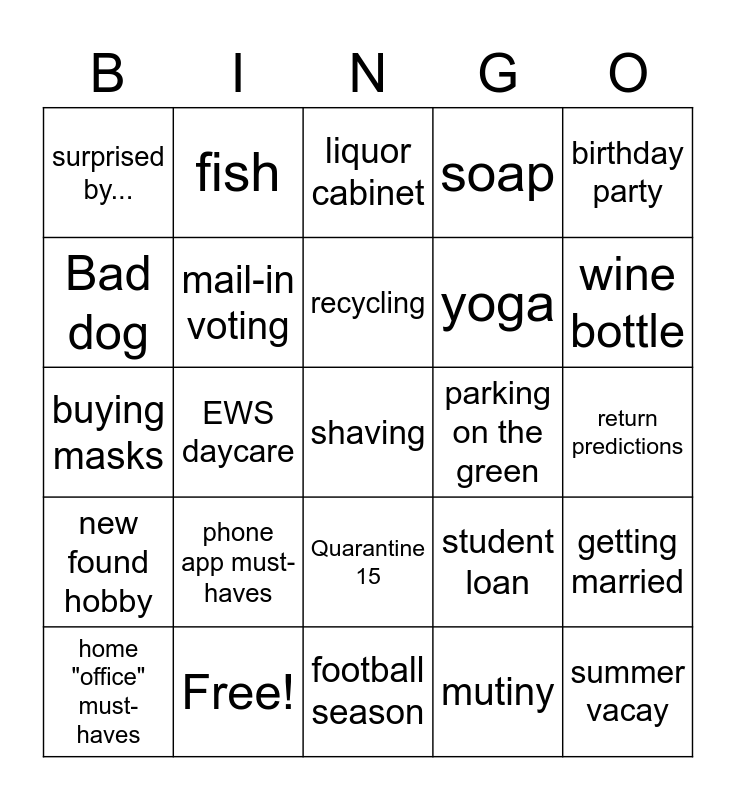 This bingo card has 28 words: getting married, meltdown, yoga, mutiny, Bad dog, liquor cabinet, fish, new found hobby, parking on the green, home "office" must-haves, buying masks, soap, Free!, football season, wine bottle, top 3 Netflix shoutout, phone app must-haves, mail-in voting, recycling, Quarantine 15, surprised by..., summer vacay, shaving, EWS daycare, return predictions, student loan, birthday party and invisibility cloak.