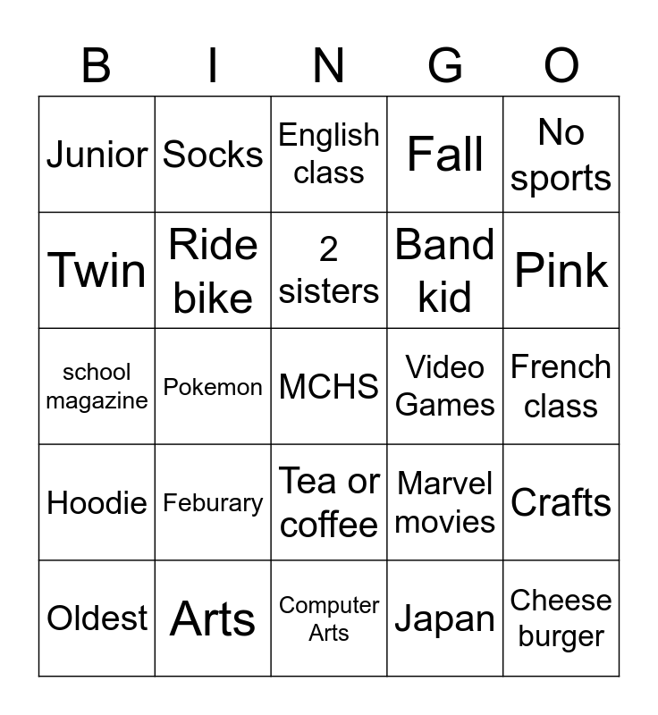 This bingo card has a free space and 24 words: Feburary, Arts, 2 sisters, Oldest, No sports, Junior, Twin, Socks, Video Games, Tea or coffee, Band kid, school magazine, Marvel movies, Crafts, Ride bike, Japan, French class, English class, Pink, Pokemon, Cheese burger, Hoodie, Fall and Computer Arts.