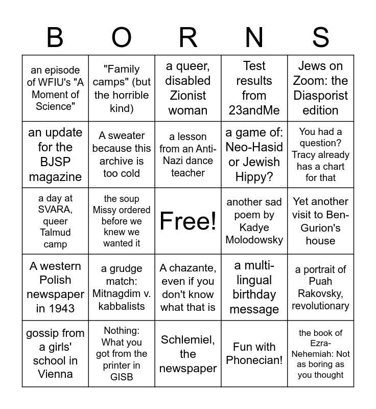 This bingo card has a free space and 24 words: a grudge match: Mitnagdim v. kabbalists, Nothing: What you got from the printer in GISB, a lesson from an Anti-Nazi dance teacher, gossip from a girls' school in Vienna, Jews on Zoom: the Diasporist edition, an episode of WFIU's "A Moment of Science", an update for the BJSP magazine, "Family camps" (but the horrible kind), another sad poem by Kadye Molodowsky, A chazante, even if you don't know what that is, a game of: Neo-Hasid or Jewish Hippy?, a day at SVARA, queer Talmud camp, a multi-lingual birthday message, a portrait of Puah Rakovsky, revolutionary, A sweater because this archive is too cold, Fun with Phonecian!, Yet another visit to Ben-Gurion's house, a queer, disabled Zionist woman, You had a question? Tracy already has a chart for that, the soup Missy ordered before we knew we wanted it, the book of Ezra-Nehemiah: Not as boring as you thought, A western Polish newspaper in 1943, Test results from 23andMe and Schlemiel, the newspaper.