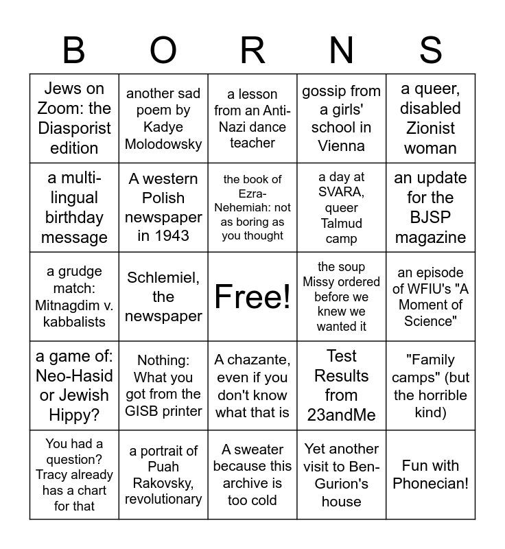 This bingo card has a free space and 24 words: Nothing: What you got from the GISB printer, a portrait of Puah Rakovsky, revolutionary, the book of Ezra-Nehemiah: not as boring as you thought, You had a question? Tracy already has a chart for that, a queer, disabled Zionist woman, Jews on Zoom: the Diasporist edition, a multi-lingual birthday message, another sad poem by Kadye Molodowsky, the soup Missy ordered before we knew we wanted it, A chazante, even if you don't know what that is, a day at SVARA, queer Talmud camp, a grudge match: Mitnagdim v. kabbalists, Test Results from 23andMe, "Family camps" (but the horrible kind), A western Polish newspaper in 1943, Yet another visit to Ben- Gurion's house, an episode of WFIU's "A Moment of Science", a lesson from an Anti- Nazi dance teacher, an update for the BJSP magazine, Schlemiel, the newspaper, Fun with Phonecian!, a game of: Neo-Hasid or Jewish Hippy?, gossip from a girls' school in Vienna and A sweater because this archive is too cold.