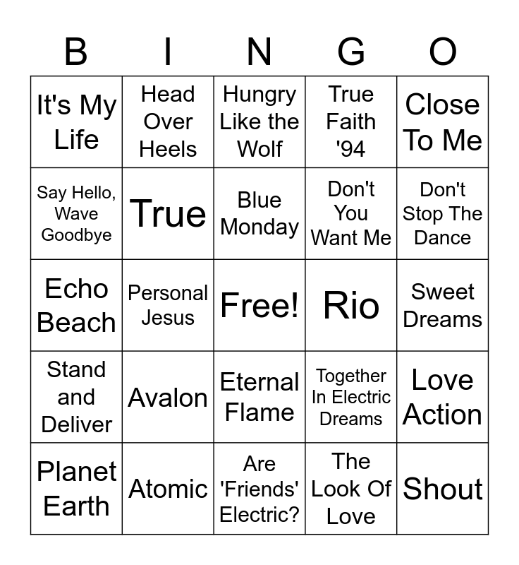 This bingo card has a free space and 55 words: Fade To Grey, Planet Earth, Poison Arrow, It's My Life, Are 'Friends' Electric?, Promised You A Miracle, True, Temptation, Don't You Want Me, Mad World, True Faith '94, Everybody Wants To Rule The World, Don't You (Forget About Me), Enjoy the Silence, Smalltown Boy, Girls on Film, Close To Me, Personal Jesus, Alive And Kicking, Shout, Rio, More Than This, Together In Electric Dreams, Hungry Like the Wolf, Cars, Blue Monday, The Look Of Love, Relax, Sweet Dreams, Love Action, Gold, Two Tribes, Don't Leave Me This Way, 19, Say Hello, Wave Goodbye, Echo Beach, Ashes to Ashes, Stand and Deliver, Call Me, Prince Charming, Head Over Heels, Somewhere in My Heart, The Whole of the Moon, Digging Your Scene, Avalon, Atomic, I Ran, Temptation, Love Is A Battlefield, Don't Stop The Dance, Don't Stop The Dance, Love Is A Battlefield, Nothing Compares 2U, Eternal Flame and Hard To Say I'm Sorry.
