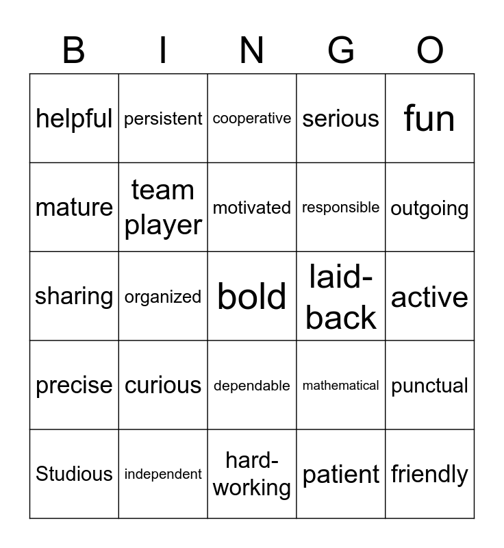 This bingo card has a free space and 25 words: Studious, curious, motivated, patient, outgoing, helpful, persistent, cooperative, responsible, punctual, sharing, team player, mathematical, friendly, mature, independent, hard-working, serious, active, precise, organized, dependable, laid-back, fun and social.