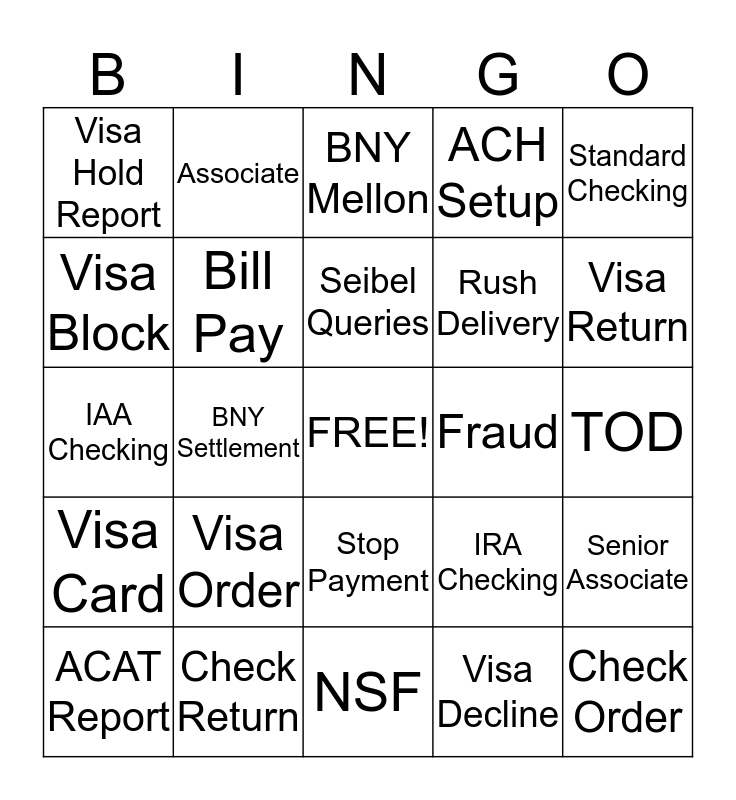 This bingo card has a free space and 24 words: Visa Order, Check Return, Seibel Queries, ACAT Report, Standard Checking, Visa Hold Report, Visa Block, Associate, Fraud, Stop Payment, Rush Delivery, IAA Checking, IRA Checking, Senior Associate, Bill Pay, Visa Decline, TOD, BNY Mellon, Visa Return, BNY Settlement, Check Order, Visa Card, ACH Setup and NSF.