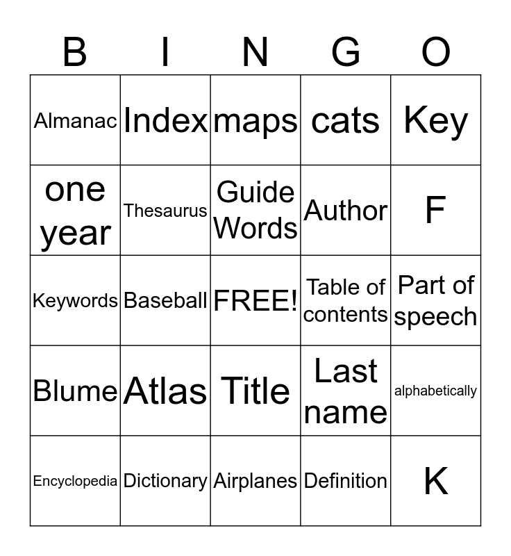 This bingo card has a free space and 24 words: Atlas, Dictionary, Guide Words, Encyclopedia, Key, Almanac, one year, Index, Table of contents, Title, Author, Keywords, Last name, alphabetically, Thesaurus, Definition, Part of speech, maps, F, Baseball, K, Blume, cats and Airplanes.