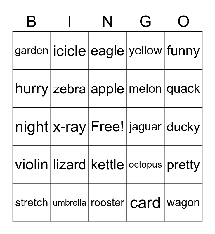 This bingo card has a free space and 24 words: lizard, umbrella, apple, stretch, funny, garden, hurry, icicle, jaguar, kettle, melon, night, octopus, pretty, zebra, card, ducky, eagle, quack, x-ray, wagon, violin, yellow and rooster.