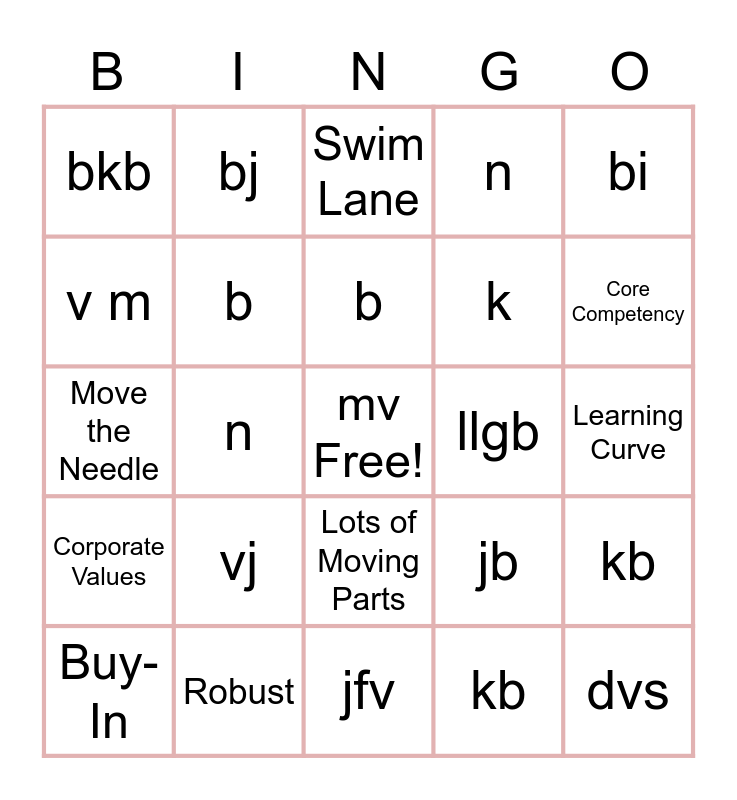 This bingo card has a free space and 47 words: sv, dvs, vsd, jfv, vj, hvj, bj, bj, v m, b jm, b, n, kb, jb, m, lb, b, llgb, bklbk, bi, n, kb, bkb, k, Core Competency, Core Competency, Buy-In, Bleeding Edge, Lots of Moving Parts, Corporate Values, Make Hay, Scalable, Best Practice, Think Outside the Box, Leverage, Robust, Learning Curve, Reach Out, Giving 110%, Take It To The Next Level, It Is What It Is, Swim Lane, Move the Needle, Tiger Teams, Thought Leader, Whiteboard It and Ideate.