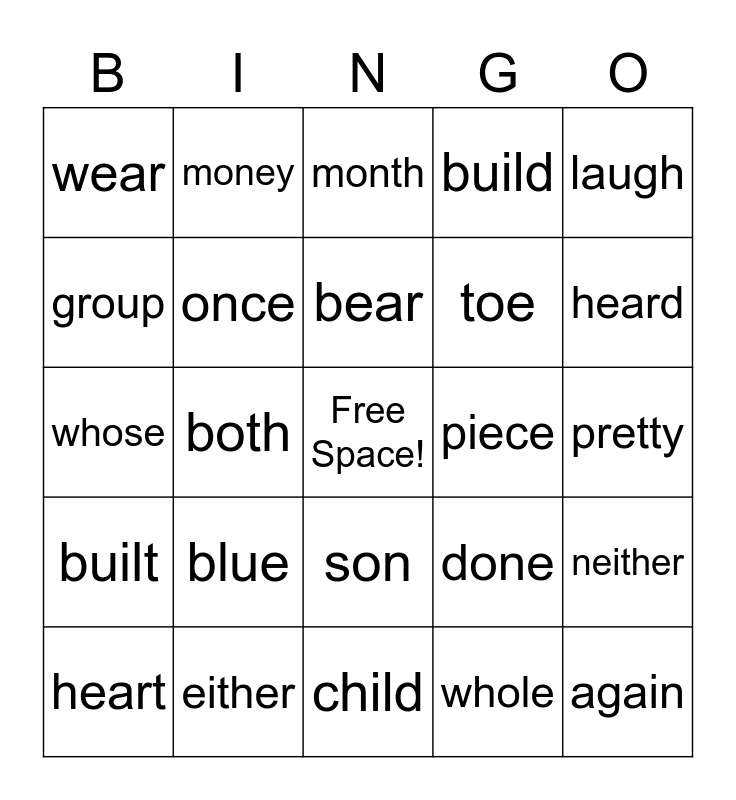 This bingo card has a free space and 24 words: blue, either, bear, heart, laugh, wear, group, money, piece, son, toe, whose, done, neither, once, whole, pretty, month, heard, both, again, built, build and child.