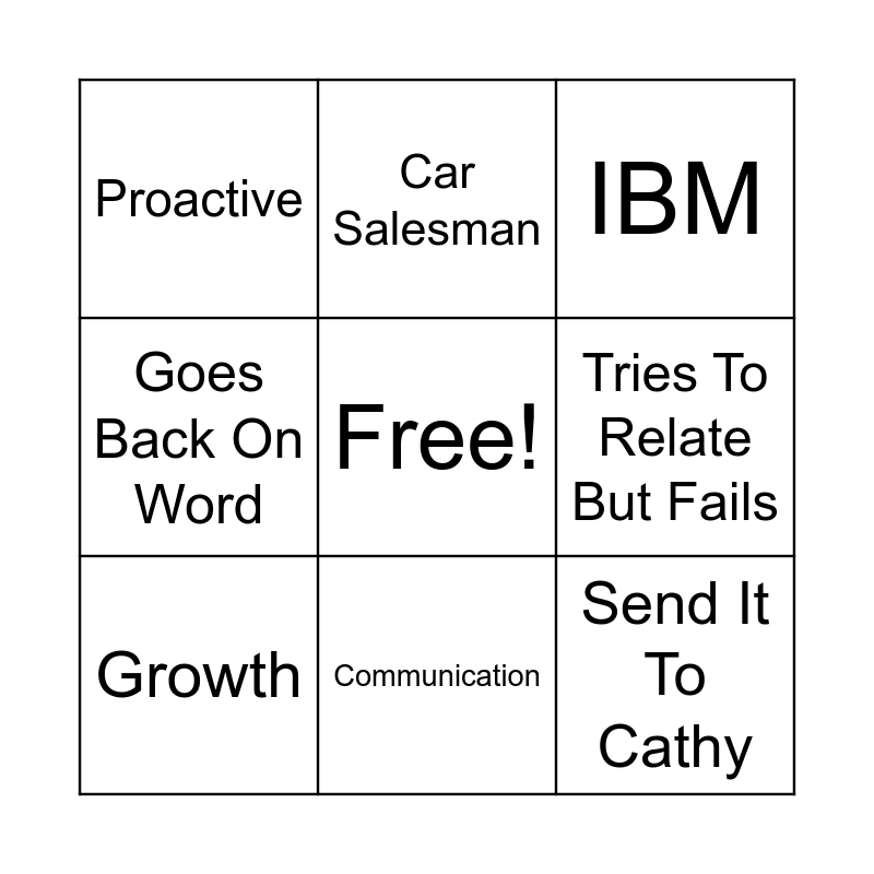 This bingo card has a free space and 8 words: Tries To Relate But Fails, IBM, Car Salesman, Growth, Proactive, Send It To Cathy, Goes Back On Word and Communication.