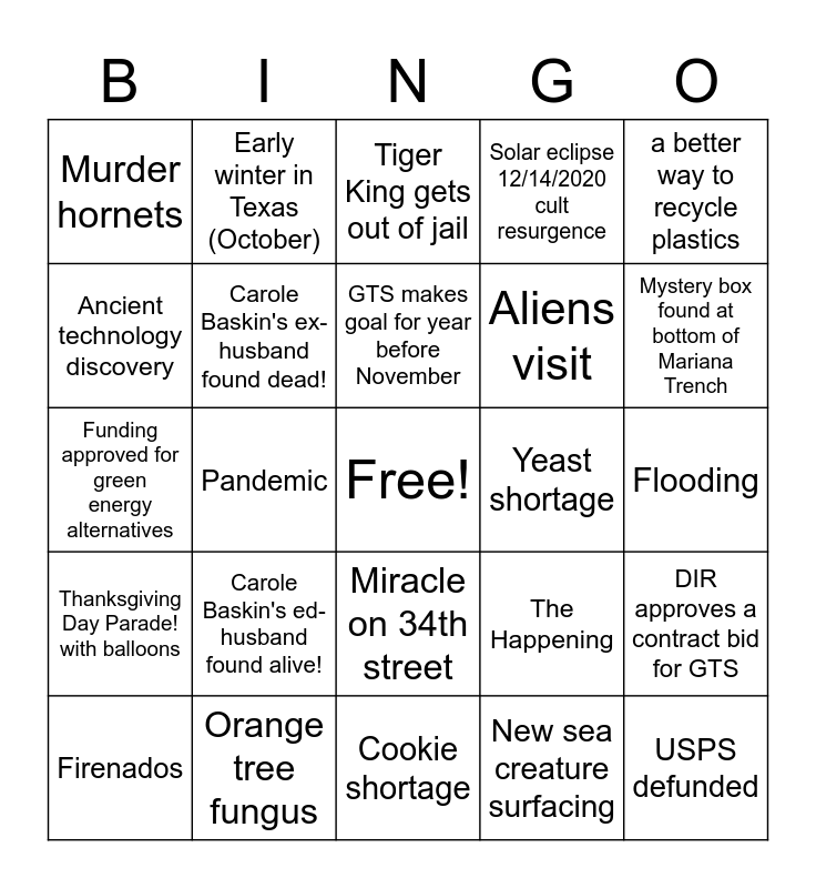 This bingo card has a free space and 29 words: Firenados, Inland hurricane/Derecho, Pandemic, Plague, Murder hornets, Tiger King gets out of jail, Carole Baskin's ex-husband found dead!, Carole Baskin's ed-husband found alive!, Yeast shortage, Orange tree fungus, Flooding, USPS defunded, Cookie shortage, New sea creature surfacing, Mystery box found at bottom of Mariana Trench, ANOTHER oil leak, Miracle on 34th street, Thanksgiving Day Parade! with balloons, a better way to recycle plastics, Funding approved for green energy alternatives, The Happening, Someone has twins, Aliens visit, Ancient technology discovery, Solar eclipse 12/14/2020 cult resurgence, Early winter in Texas (October), DIR approves a contract bid for GTS, GTS makes goal for year before November and Weight loss margaritas/beer.