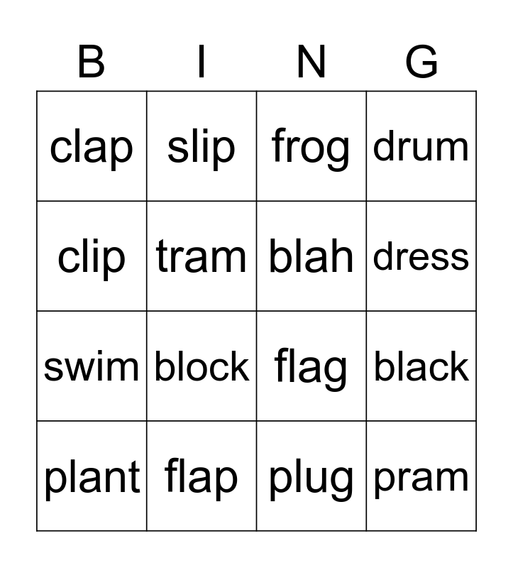This bingo card has 20 words: black, spot, frog, stem, plant, clip, flap, clap, swim, slip, block, flag, tram, pram, blah, crab, dress, drum, plug and plus.