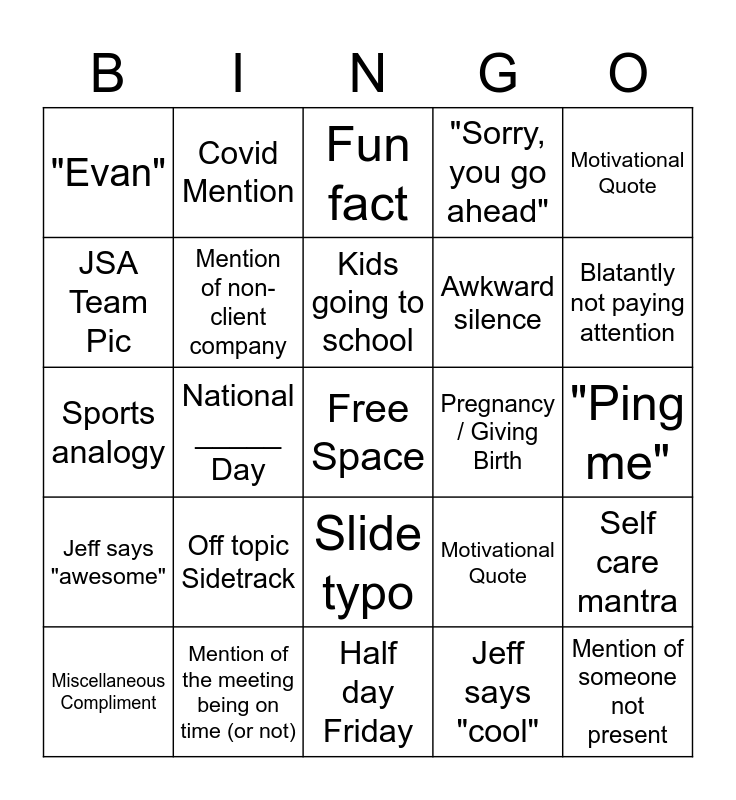 This bingo card has a free space and 24 words: Miscellaneous Compliment, Off topic Sidetrack, Kids going to school, Jeff says "cool", Motivational Quote, "Evan", Covid Mention, Fun fact, Pregnancy / Giving Birth, "Ping me", Sports analogy, Mention of non-client company, Motivational Quote, Self care mantra, JSA Team Pic, Mention of the meeting being on time (or not), Half day Friday, "Sorry, you go ahead", Blatantly not paying attention, Jeff says "awesome", National _____ Day, Slide typo, Awkward silence and Mention of someone not present.