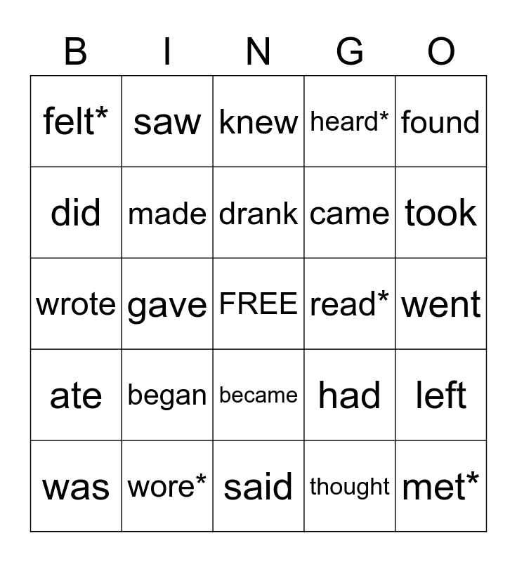 This bingo card has a free space and 24 words: began, wore*, drank, was, found, felt*, did, saw, read*, became, came, wrote, had, left, made, thought, went, knew, took, gave, met*, ate, heard* and said.
