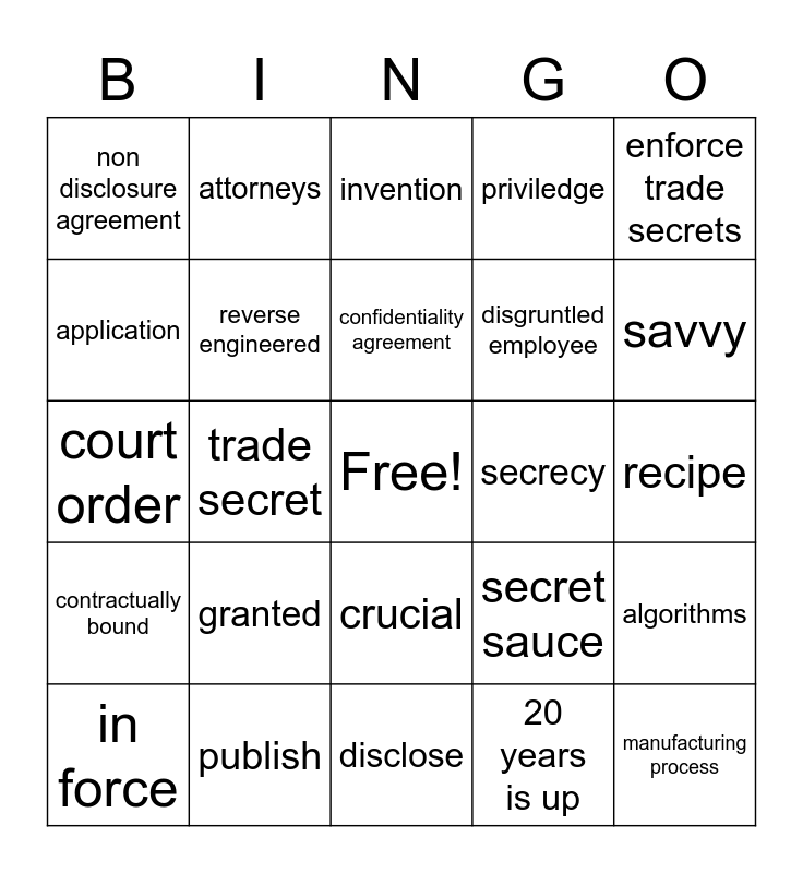 This bingo card has a free space and 24 words: granted, publish, confidentiality agreement, in force, enforce trade secrets, non disclosure agreement, application, attorneys, secrecy, crucial, disgruntled employee, court order, secret sauce, algorithms, reverse engineered, 20 years is up, recipe, invention, savvy, trade secret, manufacturing process, contractually bound, priviledge and disclose.