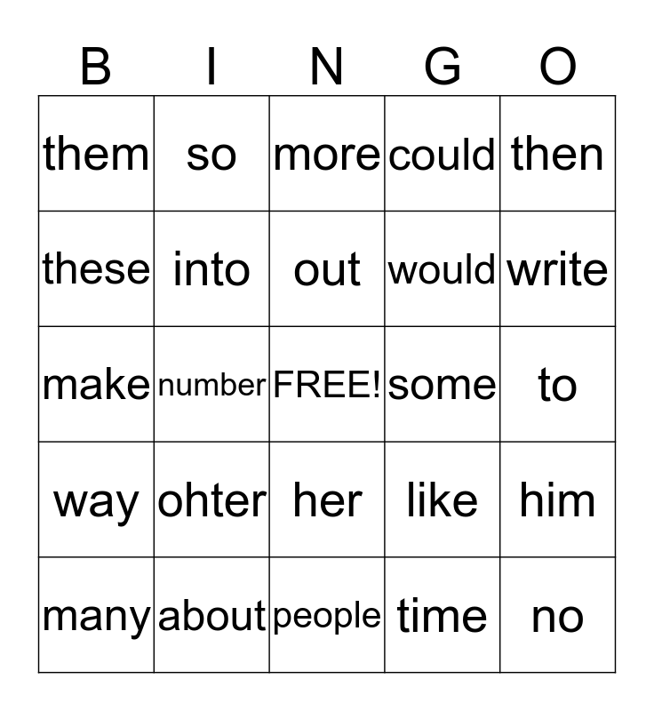 This bingo card has a free space and 24 words: ohter, about, out, many, then, them, these, so, some, her, would, make, like, him, into, time, to, more, write, number, no, way, could and people.