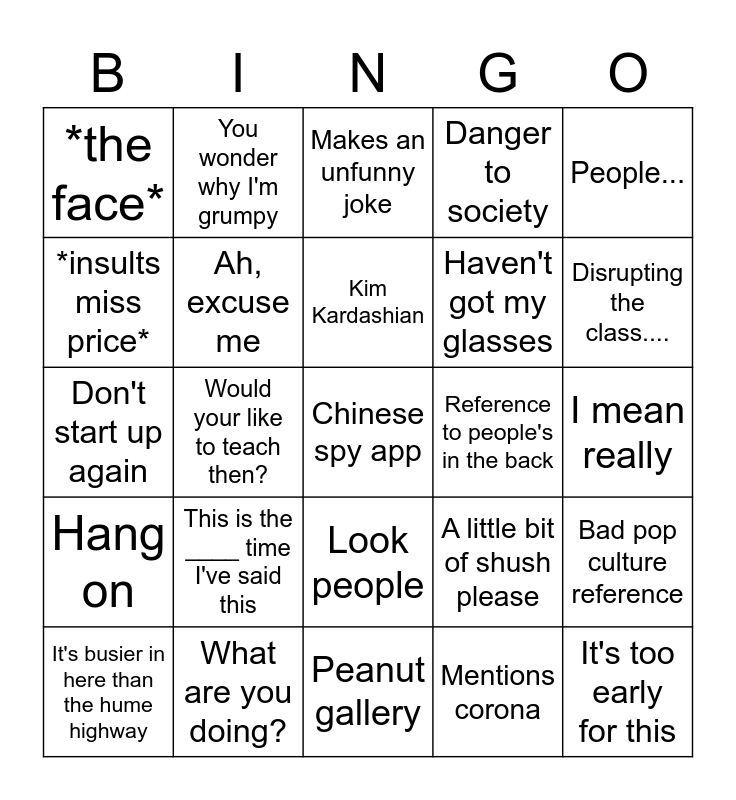 This bingo card has 30 words: What are you doing?, Hello?!, Would your like to teach then?, Reference to other class, *the face*, Makes an unfunny joke, Ah, excuse me, Look people, Reference to people's in the back, Peanut gallery, I mean really, Chinese spy app, Mentions corona, It's too early for this, Disrupting the class...., OLIVER?!!, A little bit of shush please, Hang on, This is the ____ time I've said this, People..., Don't start up again, It's not rocket science, You wonder why I'm grumpy, Haven't got my glasses, *insults miss price*, Danger to society, Bad pop culture reference, It's busier in here than the hume highway, Kim Kardashian and *hits table*.