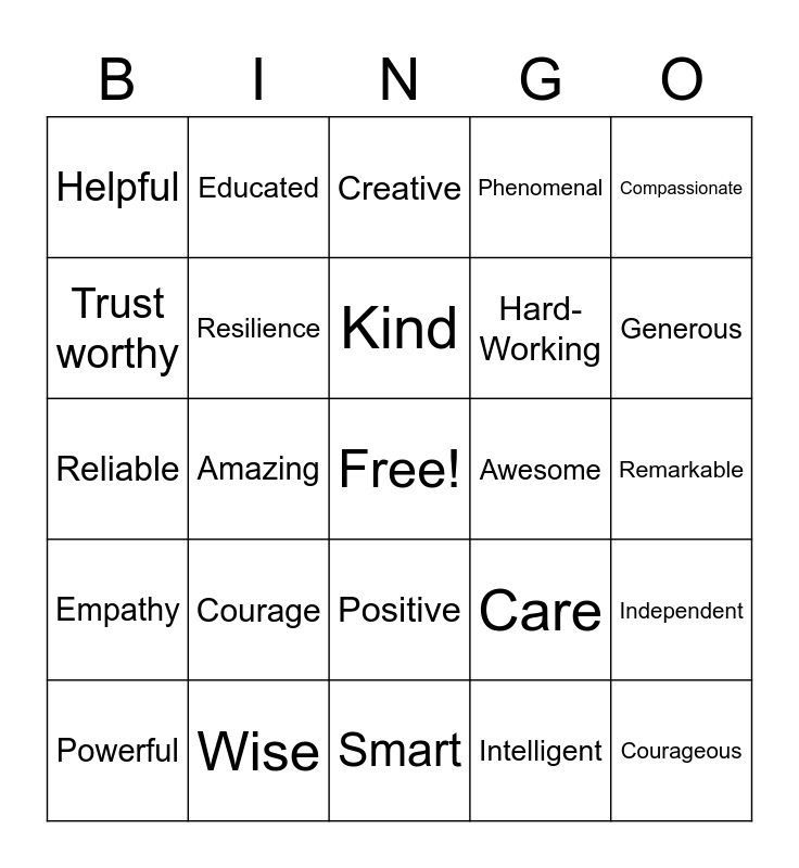 This bingo card has a free space and 36 words: Achievement, Responsibility, Respect, Resilience, Care, Empathy, Kind, Committed, Compassionate, Inspiring, Amazing, Phenomenal, Enthusiastic, Awesome, Generous, Helpful, Heroic, Courage, Courageous, Creative, Remarkable, Independent, Wise, Powerful, Smart, Educated, Reliable, Funny, Hard-Working, Trust worthy, Friendly, Optimistic, Intelligent, Positive, Personality and Healthy.