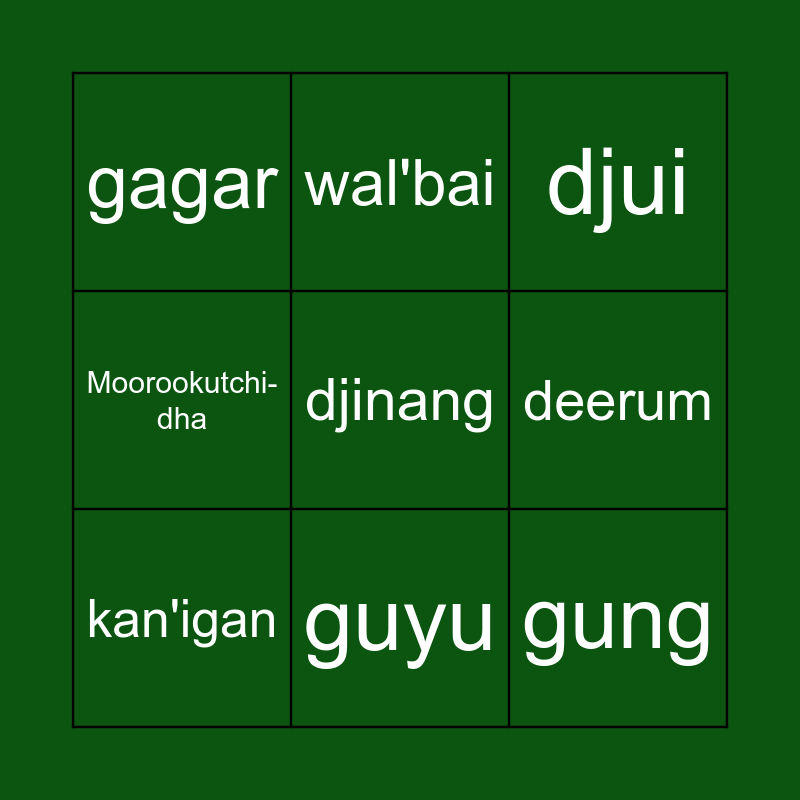 This bingo card has 15 words: Ngara, Wunya ngulum, djui, gagar, guyu, djinang, djaa, girar, deerum, gung, Mooroo-kutchi, Moorookutchi-dha, kan'igan, wal'bai and nguin.
