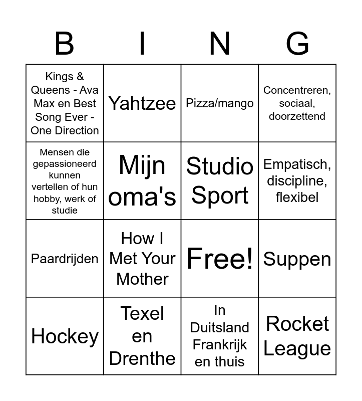 This bingo card has 19 words: Free!, Gitaar & basgitaar, Pizza/mango, Rocket League, Suppen, Mensen die gepassioneerd kunnen vertellen of hun hobby, werk of studie, In Duitsland Frankrijk en thuis, Kings & Queens - Ava Max en Best Song Ever - One Direction, Yahtzee, Paardrijden, How I Met Your Mother, Mijn oma's, Studio Sport, Texel en Drenthe, Hockey, Zelfstandig, Concentreren, sociaal, doorzettend, Empatisch, discipline, flexibel and The Handmaid's Tale.