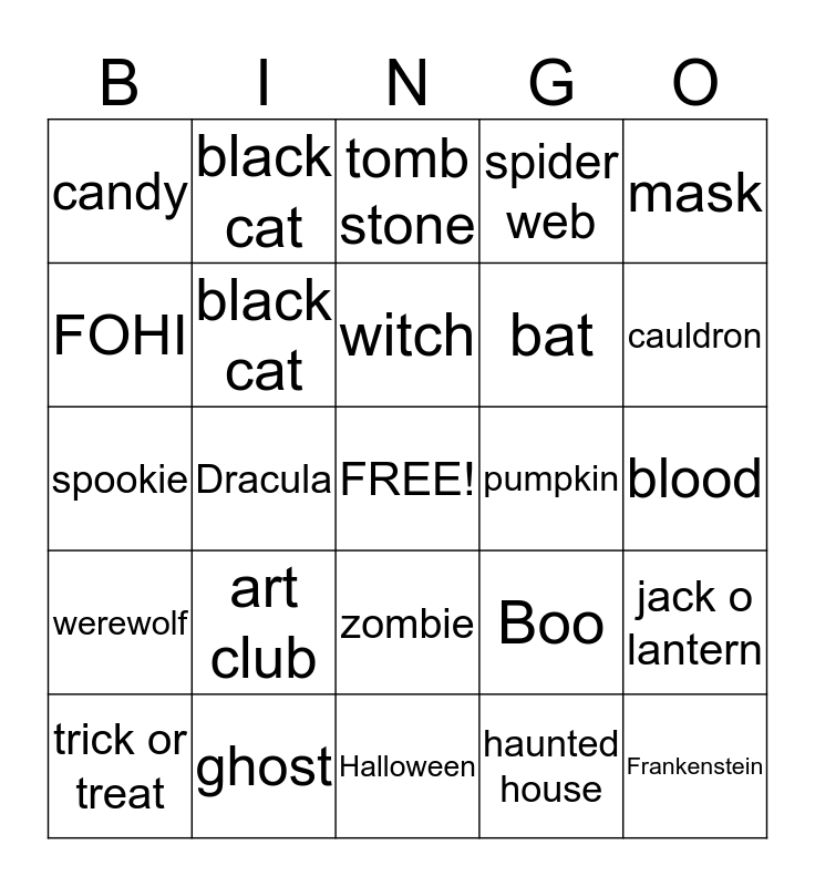 This bingo card has a free space and 24 words: art club, ghost, witch, trick or treat, mask, candy, FOHI, black cat, pumpkin, zombie, bat, spookie, Boo, jack o lantern, black cat, haunted house, blood, tomb stone, cauldron, Dracula, Frankenstein, werewolf, spider web and Halloween.