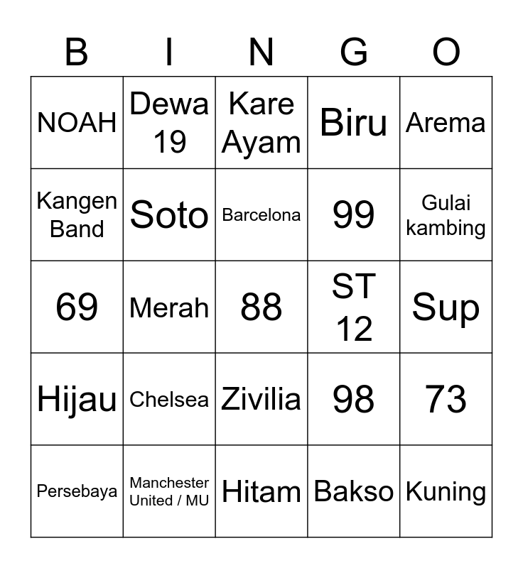 This bingo card has a free space and 24 words: Chelsea, Manchester United / MU, Barcelona, Persebaya, Arema, NOAH, Kangen Band, Dewa 19, ST 12, Zivilia, 99, 69, 98, 73, Soto, Bakso, Sup, Kare Ayam, Gulai kambing, Merah, Kuning, Hijau, Biru and Hitam.
