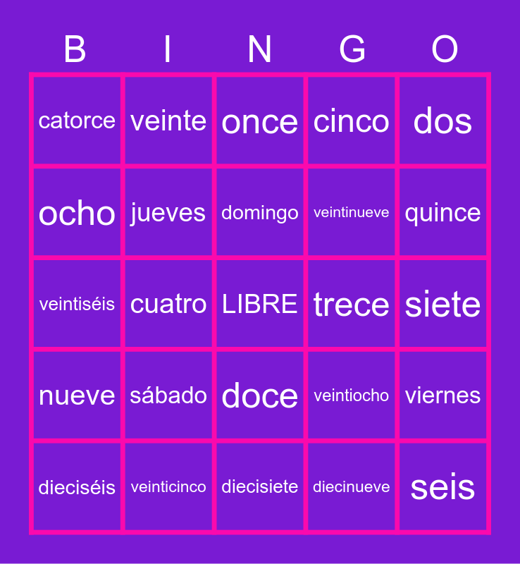 This bingo card has a free space and 37 words: lunes, martes, miércoles, jueves, viernes, sábado, domingo, uno, dos, tres, cuatro, cinco, seis, siete, ocho, nueve, diez, once, doce, trece, catorce, quince, dieciséis, diecisiete, dieciocho, diecinueve, veinte, veintiuno, veintidós, veintitrés, veinticuatro, veinticinco, veintiséis, veintisiete, veintiocho, veintinueve and treinta.