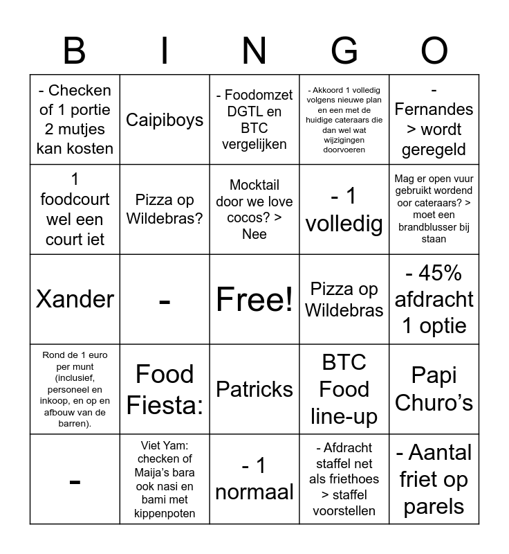 This bingo card has a free space and 27 words: BTC Food line-up, - 2 foodcoorts splitsen, - 1 volledig, - 1 normaal, 1 foodcourt wel een court iet, - Foodomzet DGTL en BTC vergelijken, Caipiboys, Rond de 1 euro per munt (inclusief, personeel en inkoop, en op en afbouw van de barren)., Pizza op Wildebras, Papi Churo’s, Xander, - Akkoord 1 volledig volgens nieuwe plan en een met de huidige cateraars die dan wel wat wijzigingen doorvoeren, -, Viet Yam: checken of Maija’s bara ook nasi en bami met kippenpoten, Mag er open vuur gebruikt wordend oor cateraars? > moet een brandblusser bij staan, Naast friet ook de sweet patato’s van Zwart? >, Pizza op Wildebras?, Mocktail door we love cocos? > Nee, Food Fiesta:, - Checken of 1 portie 2 mutjes kan kosten, - 45% afdracht 1 optie, - Afdracht staffel net als friethoes > staffel voorstellen, -, - Aantal friet op parels, Patricks, - Fernandes > wordt geregeld and - Mailen met alle vragen en info doorgeven.