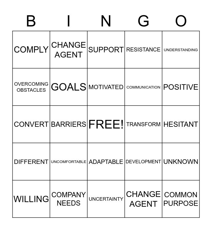 This bingo card has a free space and 24 words: UNCOMFORTABLE, COMPANY NEEDS, MOTIVATED, WILLING, UNDERSTANDING, COMPLY, OVERCOMING OBSTACLES, CHANGE AGENT, TRANSFORM, ADAPTABLE, COMMUNICATION, CONVERT, DEVELOPMENT, UNKNOWN, GOALS, CHANGE AGENT, HESITANT, SUPPORT, POSITIVE, BARRIERS, COMMON PURPOSE, DIFFERENT, RESISTANCE and UNCERTAINTY.