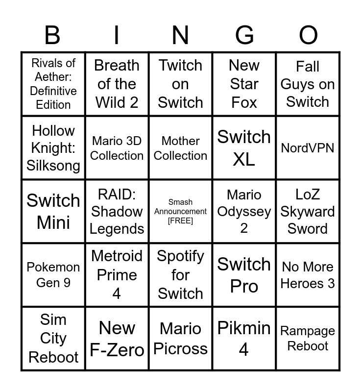 This bingo card has a free space and 24 words: Metroid Prime 4, New F-Zero, Mother Collection, Sim City Reboot, Fall Guys on Switch, Rivals of Aether: Definitive Edition, Hollow Knight: Silksong, Breath of the Wild 2, Mario Odyssey 2, Spotify for Switch, Switch XL, Switch Mini, Switch Pro, No More Heroes 3, Mario 3D Collection, Pikmin 4, LoZ Skyward Sword, Twitch on Switch, NordVPN, RAID: Shadow Legends, Rampage Reboot, Pokemon Gen 9, New Star Fox and Mario Picross.