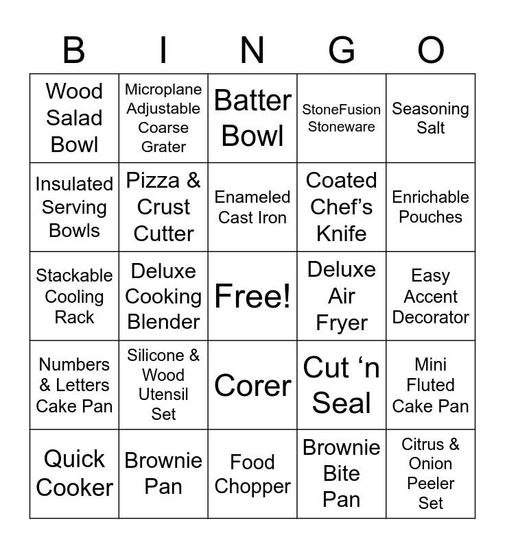 This bingo card has a free space and 39 words: Mix ‘n Chop, Potato Masher, Scoop & Serve Spatula, Pizza & Crust Cutter, Quick Cooker, Corer, Enameled Cast Iron, Pizza Peel, Seasoning Salt, Numbers & Letters Cake Pan, Deluxe Cooking Blender, StoneFusion Stoneware, Citrus & Onion Peeler Set, Easy Accent Decorator, Deluxe Air Fryer, Silicone & Wood Utensil Set, Rock rock Dutch Oven, Wood Salad Bowl, Digital Kitchen Scale, Cut ‘n Seal, Insulated Serving Bowls, Food Chopper, Coated Chef’s Knife, Enrichable Pouches, Manual Food Processor, Simple Slicer, Cast Iron Skillets, Nylon Straining Ladle, Teak Wooden Corner Spoon, Microplane Adjustable Coarse Grater, Ultimate Knife Set, Cake Tester & Release, Batter Bowl, Brownie Pan, Brownie Bite Pan, Donut Pan, Mini Fluted Cake Pan, Stackable Cooling Rack and Easy Read Measuring Cups.
