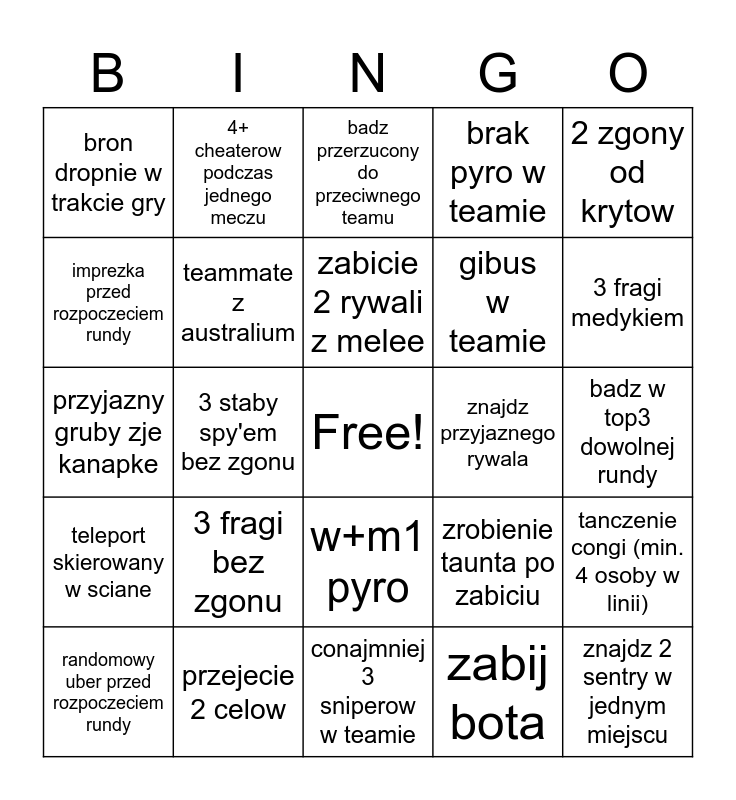This bingo card has a free space and 24 words: 3 fragi bez zgonu, przejecie 2 celow, zabicie 2 rywali z melee, randomowy uber przed rozpoczeciem rundy, 2 zgony od krytow, bron dropnie w trakcie gry, imprezka przed rozpoczeciem rundy, 4+ cheaterow podczas jednego meczu, znajdz przyjaznego rywala, w+m1 pyro, gibus w teamie, przyjazny gruby zje kanapke, zrobienie taunta po zabiciu, tanczenie congi (min. 4 osoby w linii), teammate z australium, zabij bota, badz w top3 dowolnej rundy, badz przerzucony do przeciwnego teamu, 3 fragi medykiem, 3 staby spy'em bez zgonu, znajdz 2 sentry w jednym miejscu, teleport skierowany w sciane, brak pyro w teamie and conajmniej 3 sniperow w teamie.