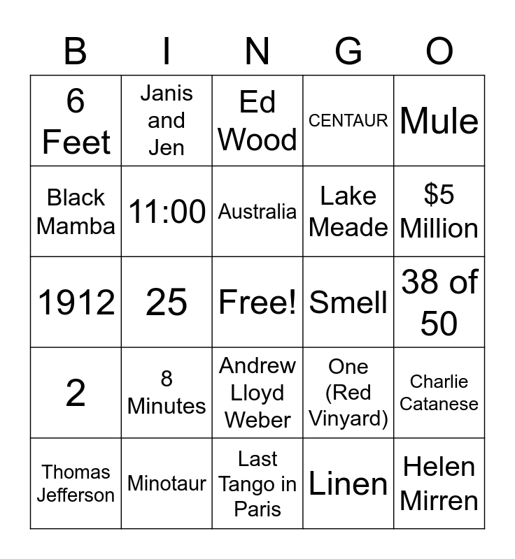 This bingo card has a free space and 38 words: 4, You need a camera, 8, 11:00, Charlie Catanese, 8 Minutes, Australia, China, Mule, Lake Meade, 25, CENTAUR, Helen Mirren, 38 of 50, Black Mamba, 2, Call me Ishmael, Ed Wood, Eli Whitney, Smell, 6 Feet, Minotaur, $5 Million, Thomas Jefferson, The Telephone, Last Tango in Paris, Pacific Ocean, Long Island, Cucumber, London, Dolly Parton, Andrew Lloyd Weber, Linen, Janis and Jen, Capt. America, One (Red Vinyard), 1912 and Solomon Grundy.