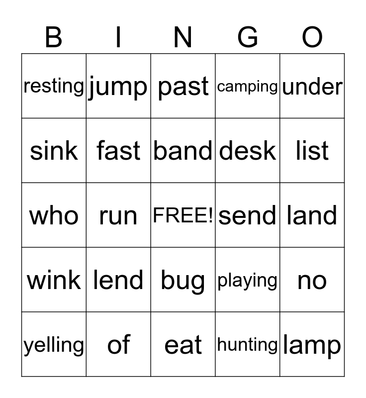 This bingo card has a free space and 24 words: lend, of, band, yelling, under, resting, sink, jump, send, bug, desk, who, playing, no, fast, hunting, land, past, list, run, lamp, wink, camping and eat.