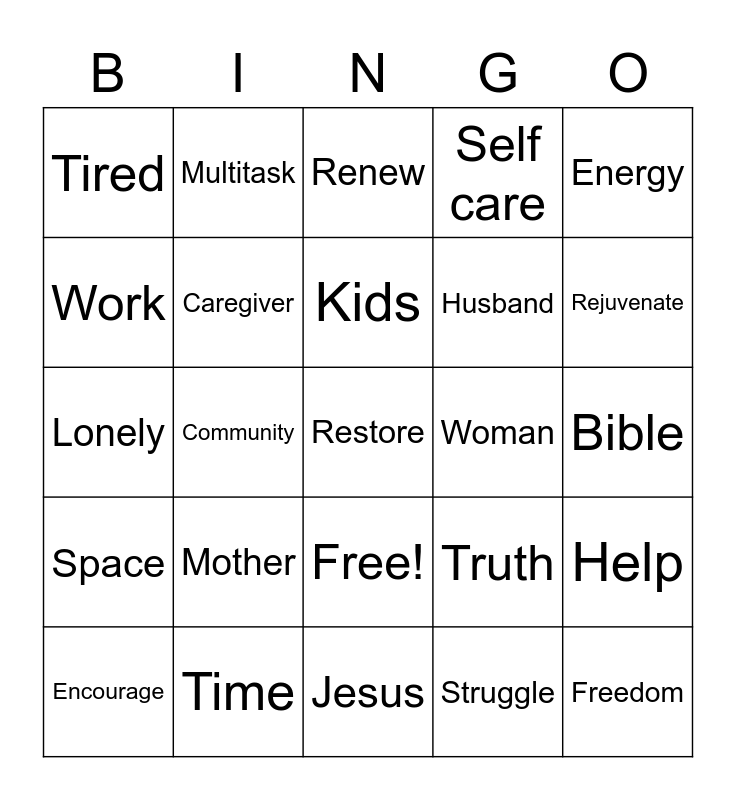This bingo card has 26 words: Free!, Struggle, Kids, Time, Energy, Tired, Work, Multitask, Bible, Truth, Husband, Lonely, Help, Encourage, Community, Support, Self care, Space, Renew, Restore, Rejuvenate, Jesus, Woman, Mother, Caregiver and Freedom.
