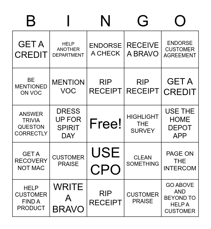 This bingo card has a free space and 24 words: CUSTOMER PRAISE, WRITE A BRAVO, RIP RECEIPT, HELP CUSTOMER FIND A PRODUCT, ENDORSE CUSTOMER AGREEMENT, GET A CREDIT, BE MENTIONED ON VOC, HELP ANOTHER DEPARTMENT, HIGHLIGHT THE SURVEY, USE CPO, RIP RECEIPT, ANSWER TRIVIA QUESTON CORRECTLY, CLEAN SOMETHING, PAGE ON THE INTERCOM, MENTION VOC, CUSTOMER PRAISE, USE THE HOME DEPOT APP, ENDORSE A CHECK, GET A CREDIT, DRESS UP FOR SPIRIT DAY, GO ABOVE AND BEYOND TO HELP A CUSTOMER, GET A RECOVERY NOT MAC, RECEIVE A BRAVO and RIP RECEIPT.