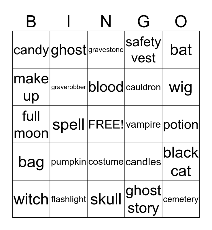 This bingo card has a free space and 25 words: pumpkin, skull, blood, witch, bat, candy, make up, ghost, vampire, costume, cauldron, full moon, candles, black cat, graverobber, mummy, potion, gravestone, wig, spell, cemetery, flashlight, bag, safety vest and ghost story.
