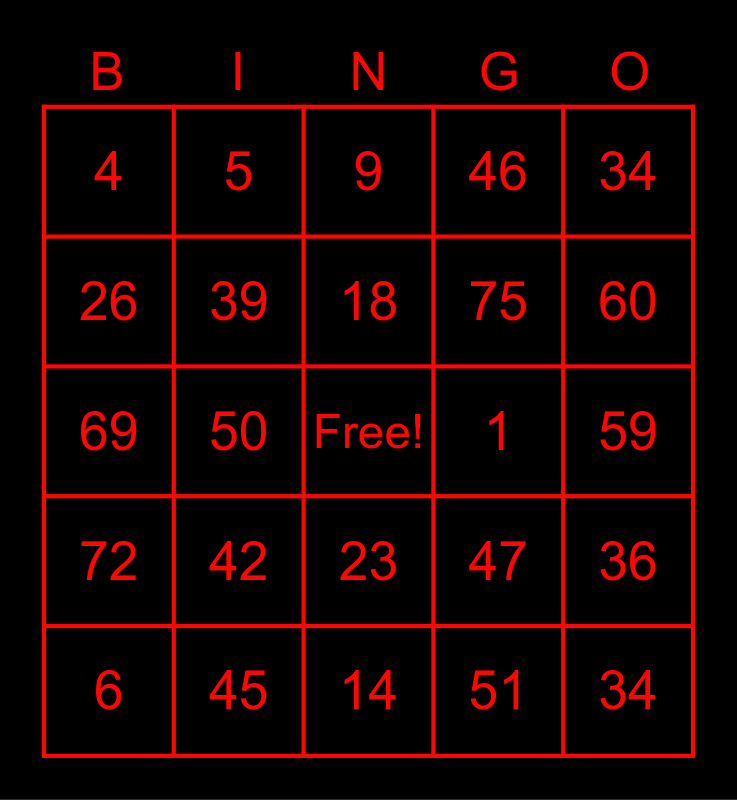 This bingo card has a free space and 24 words: 42, 45, 18, 6, 34, 4, 26, 5, 1, 23, 75, 69, 47, 36, 39, 51, 59, 9, 60, 50, 34, 72, 46 and 14.