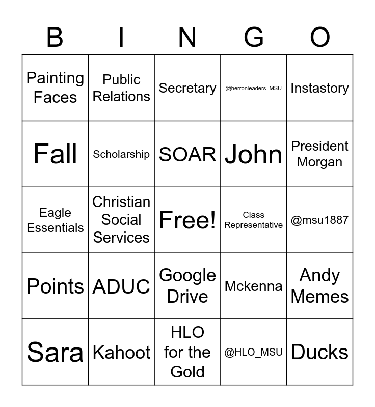 This bingo card has a free space and 54 words: Mindy, Points, Baby Herron's, Eagle Fest, Google Drive, Mac-and-Cheese, @herronleaders_MSU, Virtual Meetings, Fall, Philanthropy Chair, Painting Faces, Zoom, Kahoot, Sara, Alumni Relations, HLO for the Gold, Ducks, John, Tuesday's, @msu1887, Mckenna, Guess Who, Class Representative, Instastory, Groupme, Public Relations, Alan, Life Lessons, Career Fair, @HLO_MSU, Dairy Queen, Herron Potluck, Chili Cook-off, Scavenger Hunt, Secretary, Victory Milkshakes, Eagle Essentials, Andy Memes, Blankets, Scholarship, FYS, Abbey Akers, Keith, Homecoming, ADUC, The Marvelous Mrs. Maisel, Mentor, History, SOAR, Christian Social Services, President Morgan, Dudley, Pomp and Gymnastics.