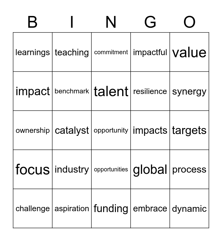 This bingo card has a free space and 38 words: agile, navigate, growth, benchmark, process, industry, talent, red-tape, value, resilience, catalyst, impactful, dynamic, targets, impact, focus, partner, commitment, relevant, impacts, learnings, aspiration, synergy, challenge, potential, funding, future, pipe-line, sustainable, external, significant, opportunities, embrace, teaching, research, global, ownership and strength.