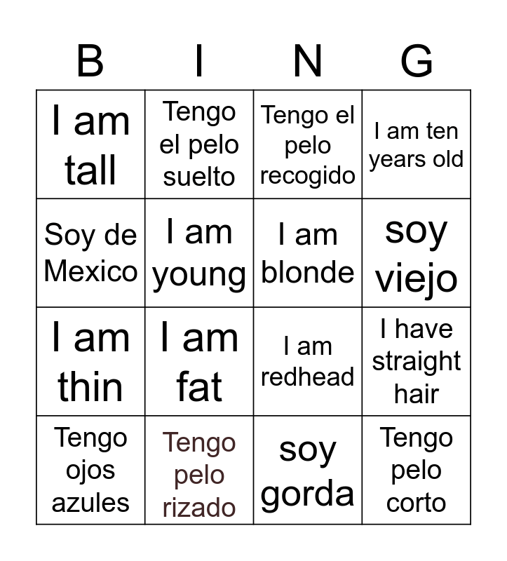This bingo card has 16 words: Tengo pelo rizado, I have straight hair, Tengo el pelo recogido, I am tall, I am thin, Tengo el pelo suelto, I am redhead, soy gorda, Soy de Mexico, I am young, Tengo ojos azules, I am ten years old, I am fat, soy viejo, I am blonde and Tengo pelo corto.