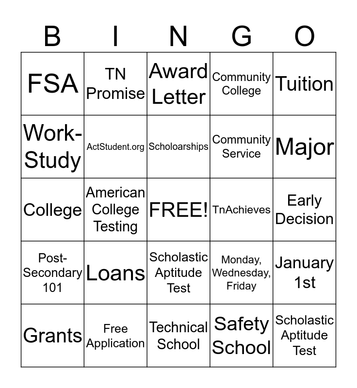 This bingo card has a free space and 24 words: Loans, Free Application, Scholoarships, Grants, Tuition, FSA, Work-Study, TN Promise, TnAchieves, Scholastic Aptitude Test, Community Service, College, Monday, Wednesday, Friday, January 1st, ActStudent.org, Safety School, Early Decision, Award Letter, Major, American College Testing, Scholastic Aptitude Test, Post-Secondary 101, Community College and Technical School.