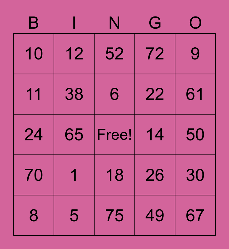 This bingo card has a free space and 24 words: 1, 5, 6, 8, 9, 10, 11, 12, 14, 18, 22, 24, 26, 30, 38, 49, 50, 52, 61, 65, 67, 70, 72 and 75.