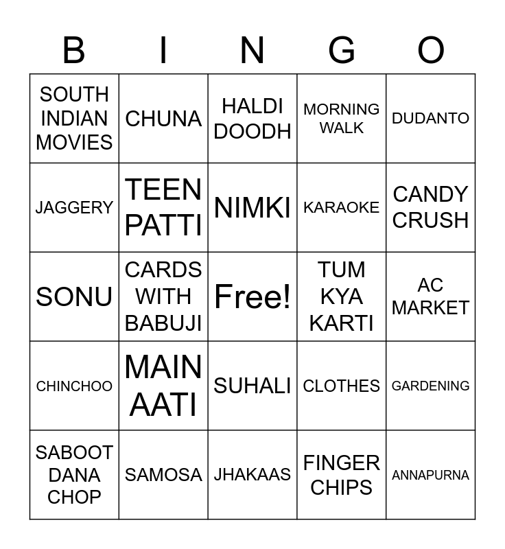This bingo card has a free space and 40 words: MINI MUMMY, SONU, POKER, TEEN PATTI, SAMOSA, SUHALI, NIMKI, BYE JOE, DUDANTO, CHINCHOO, CARDS WITH BABUJI, MORNING WALK, ANNAPURNA, AC MARKET, TUM KYA KARTI, MAIN AATI, TU JAATI, SOUTH INDIAN MOVIES, ONLINE SHOPPING, HALDI DOODH, GARDENING, FINGER CHIPS, KARAOKE, JAGGERY, KACHORI SABZI, MAALI, CAR HONKING, WHATS APP, NIMBOO, CHUDWA MATAR, MUSK AGARBATTI, SABOOT DANA CHOP, PERFUMES, CLOTHES, CANDY CRUSH, JHAKAAS, SUPARI, SHARE MARKET TOAST, CHUNA and COSMO.