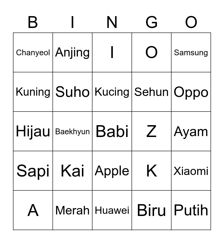 This bingo card has a free space and 24 words: Kai, Merah, Kucing, A, Samsung, Chanyeol, Kuning, Anjing, Z, Apple, Sehun, Hijau, K, Xiaomi, Suho, Biru, Ayam, I, Oppo, Baekhyun, Putih, Sapi, O and Huawei.