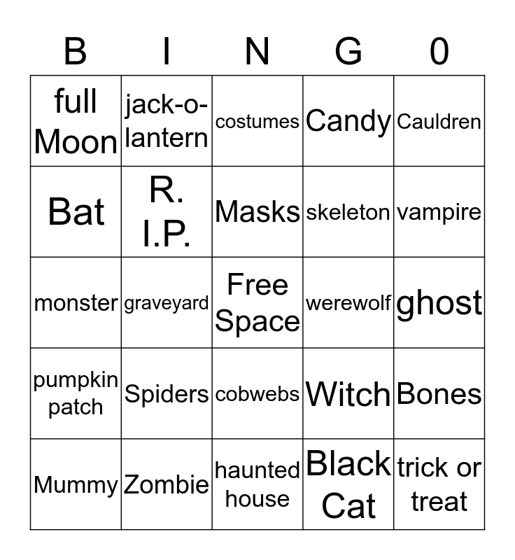 This bingo card has a free space and 24 words: Spiders, Zombie, Masks, Mummy, Cauldren, full Moon, Bat, jack-o-lantern, werewolf, cobwebs, skeleton, monster, Witch, Bones, R. I.P., Black Cat, ghost, costumes, vampire, graveyard, trick or treat, pumpkin patch, Candy and haunted house.