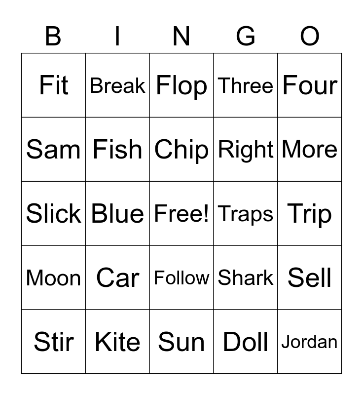 This bingo card has a free space and 24 words: Stir, Car, Chip, Doll, Four, Fit, Break, Flop, Traps, Trip, Slick, Fish, Shark, Sell, Sam, Kite, Sun, Three, More, Moon, Blue, Follow, Right and Jordan.