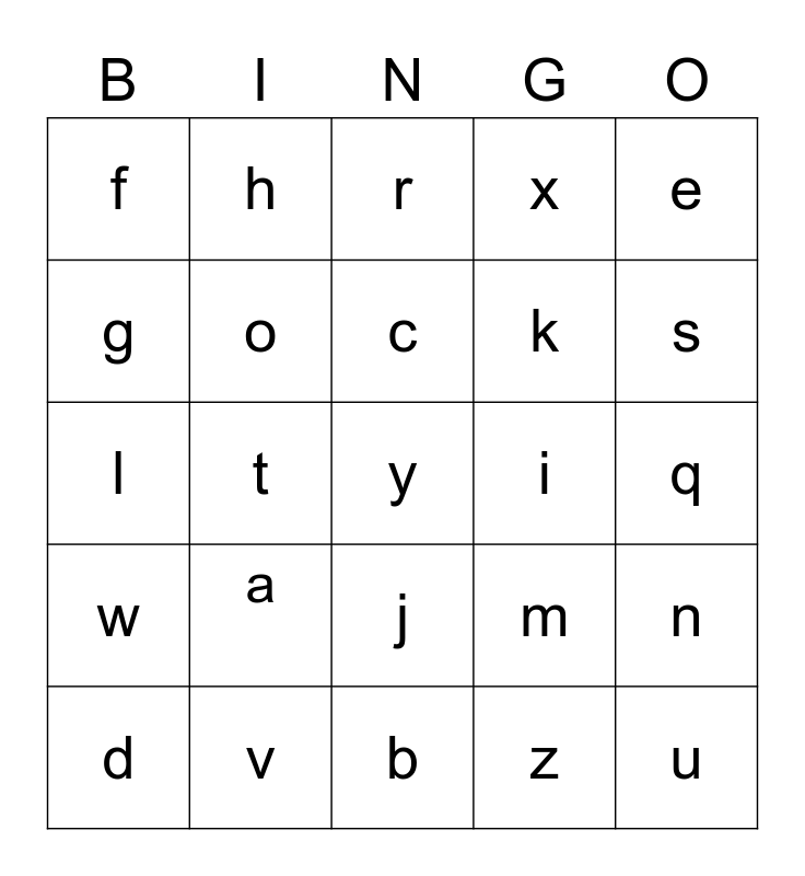 This bingo card has a free space and 25 words: a, b, c, d, e, f, g, h, i, j, k, l, m, n, o, p, q, r, s, t, u, v, w, x and z.