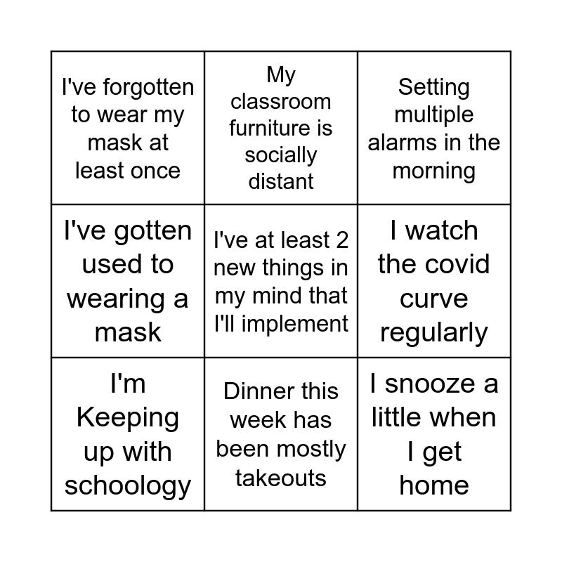 This bingo card has 9 words: I'm Keeping up with schoology, Setting multiple alarms in the morning, My classroom furniture is socially distant, I've gotten used to wearing a mask, I've forgotten to wear my mask at least once, I watch the covid curve regularly, I've at least 2 new things in my mind that I'll implement, I snooze a little when I get home and Dinner this week has been mostly takeouts.
