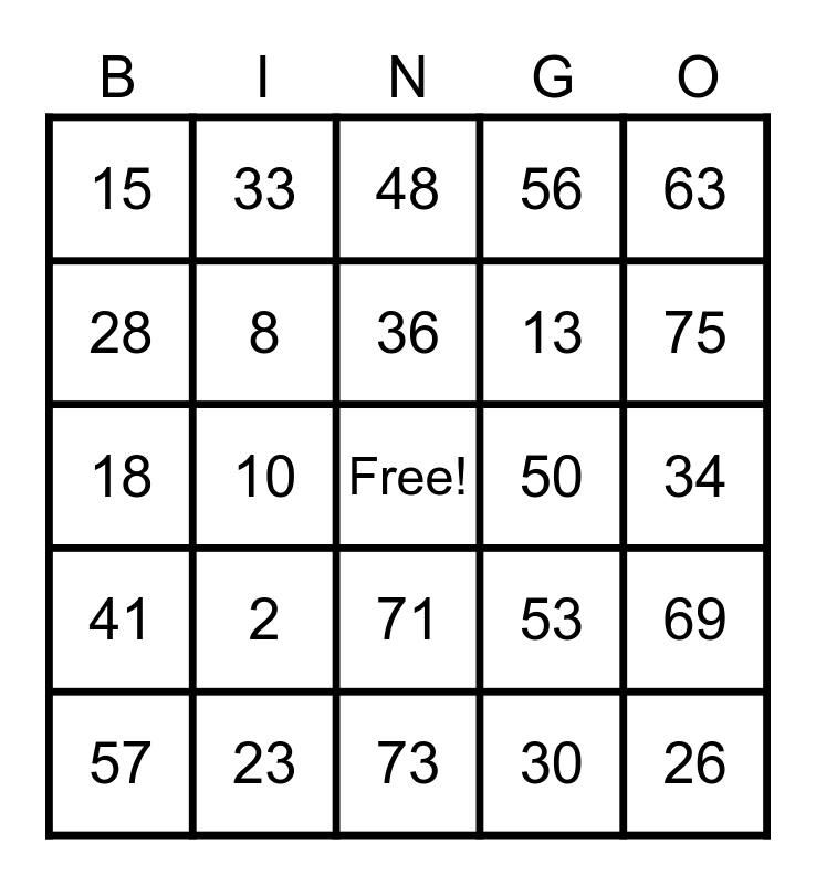 This bingo card has a free space and 24 words: 2, 23, 36, 57, 63, 15, 28, 33, 50, 71, 13, 18, 53, 69, 8, 30, 34, 48, 75, 10, 26, 41, 56 and 73.