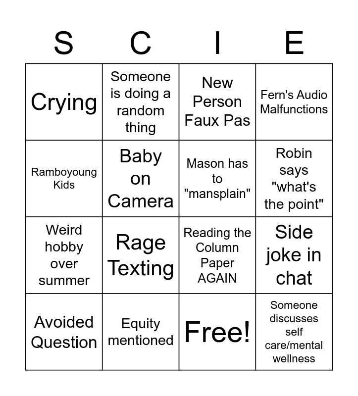 This bingo card has 17 words: Free!, Avoided Question, New Person Faux Pas, Crying, Rage Texting, Fern's Audio Malfunctions, Side joke in chat, Mason has to "mansplain", Robin says "what's the point", Baby on Camera, Equity mentioned, Reading the Column Paper AGAIN, Ramboyoung Kids, Someone is doing a random thing, Weird hobby over summer, Hailey says something dumb and Someone discusses self care/mental wellness.